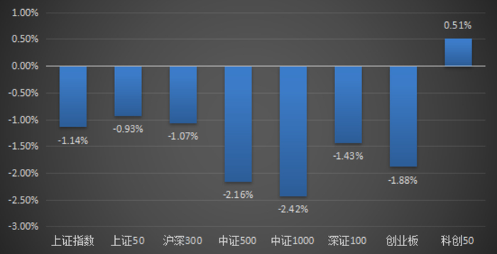 上周市场除科创50外,全面下跌,截至上周五收盘上证指数下跌-1.14%。各品种隐含波动率涨跌互现。各品种的20天实际波动率与前一周相比均出现下跌。其他指数涨跌幅度如下图: