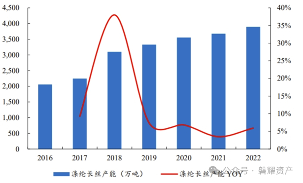 2016年至2022年间,国内涤纶长丝产能规模稳步扩张,总产能由2056万吨陆续提升至3897万吨,年均复合增速达到11.25%,其中2022年行业总产能同比增长 5.93%,新增产能218万吨。