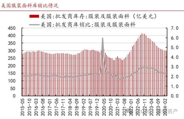 展望海外纺服行业,美国是我国纺织品最大出口市场。美国纺织服装行业的零售额在疫情期间出现了较大幅度的下滑,疫情过后行业呈现着复苏趋势,服装服饰店零售额也在逐渐恢复。2022 年美国进口纺织品服装金额达到1160.58 亿美元,同比增长 9.19%,处于历史高位。截至 2024 年 2 月,美国服装服饰店零售额已到达 264.62 亿美元,处于历史较高水平。与此同时,美国服装服饰店库销比处于历史偏低水平,有望在 2024 年迎来补库周期。