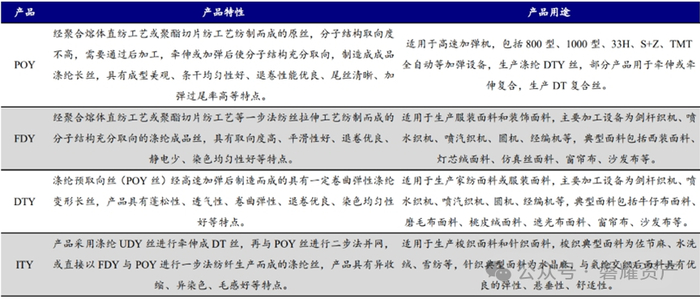 涤纶又称聚酯纤维,上游为石化产业,以PTA和MEG为原料缩聚制得聚酯,再经熔体直纺或切片纺加工成丝,按长度可分为涤纶长丝和涤纶短纤。涤纶长丝的长度通常在千米以上,而涤纶短纤则在几厘米至十几厘米,通常由长丝束切断制得。据中国化学纤维工业协会数据,2022年我国涤纶长丝产量占国内化纤总产量的65.91%。涤纶长丝凭借易洗快干、结实耐用、弹性好、耐光性好、耐腐蚀等特点,广泛应用于服装、家用纺织、产业纺织等领域。其中POY、DTY、FDY是民用长丝的主流品种。