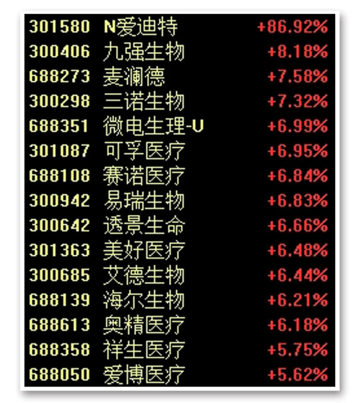受此影响,医疗器械、减肥药、医疗服务等板块走强。其中,今天上市的新股N爱迪特涨86.92%,争光股份、博瑞医药涨超10%。
