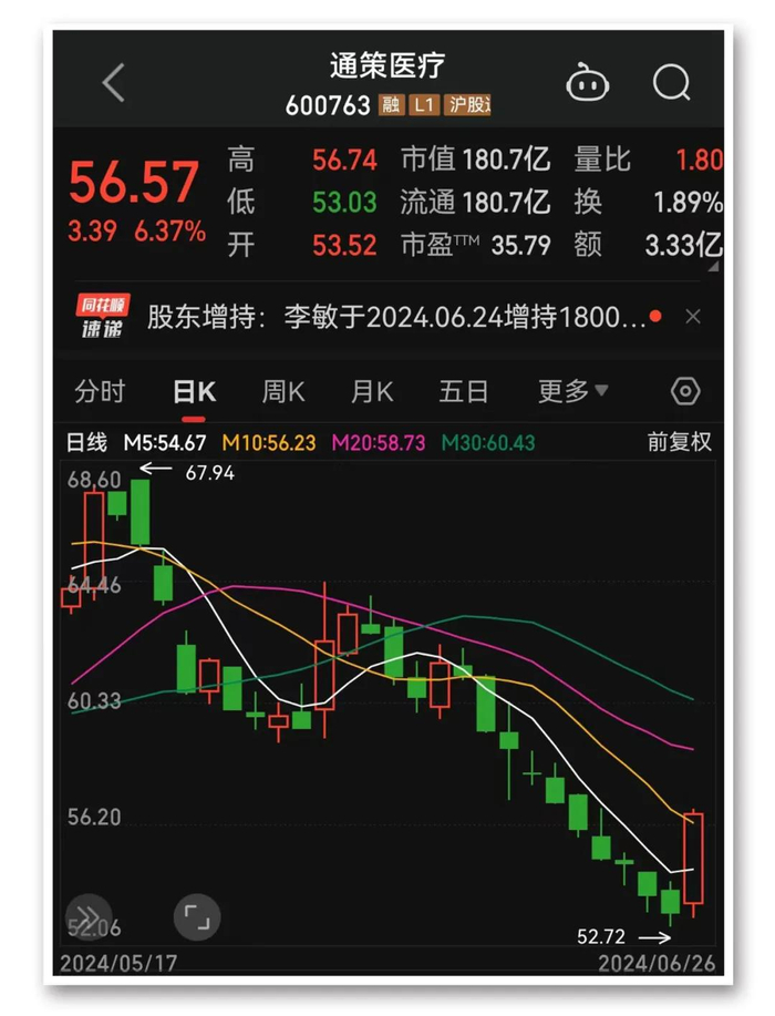 此前连跌10日的通策医疗拉升反弹,收盘涨6.37%,现报56.57元,总市值181亿元。
