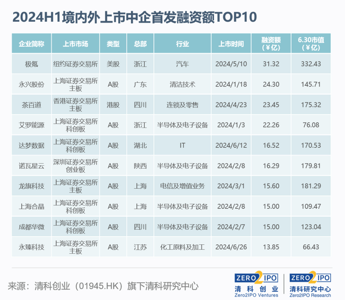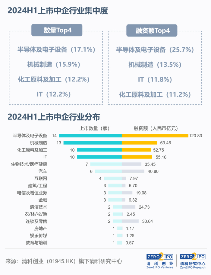 2024年上半年,约6成IPO企业集中在半导体及电子设备、机械制造、化工原料及加工、IT四大行业,融资规模合计占比62.3%。2024年上半年对比2023年全年,行业上市数量前五排名基本不变,半导体及电子设备、机械制造、化工原料及加工行业持续领衔,生物技术/医疗健康排名下降至第五,IT行业排名上升一位进入前四。