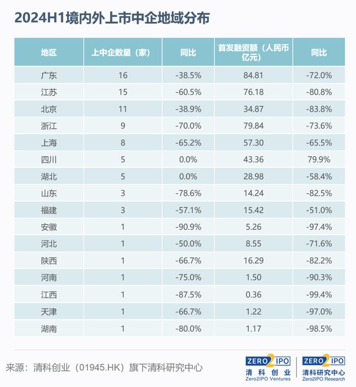 从上市数量来看,广东以16家中企上市的成绩排名第一,江苏和北京次之。首发融资额方面,广东、浙江和江苏居于前列,三个地区合计融资240.82亿元,占比全市场51.3%。