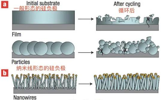 但硅有一个致命弱点——充放电过程中体积膨胀非常严重,锂离子进入时膨胀,膨胀率最高达300%(碳的膨胀率只有16%),锂离子离开后又收缩,一膨一缩之间,材料就会破碎和粉化。在实际使用中,会导致电池衰减速度极快,充电循环次数极低。