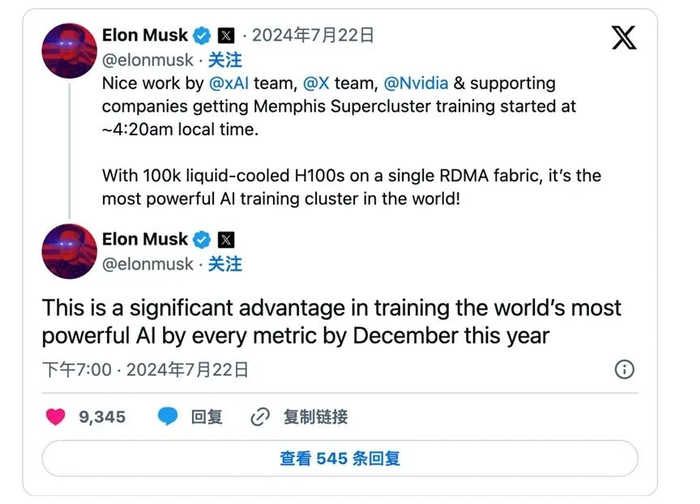 马斯克进一步详细说明,该集群由 100,000 个液冷H100 图形处理单元 (GPU)组成,这是 Nvidia 从去年开始提供的芯片,受到 AI 模型提供商的高度需求,包括马斯克在OpenAI的竞争对手(和前朋友)。