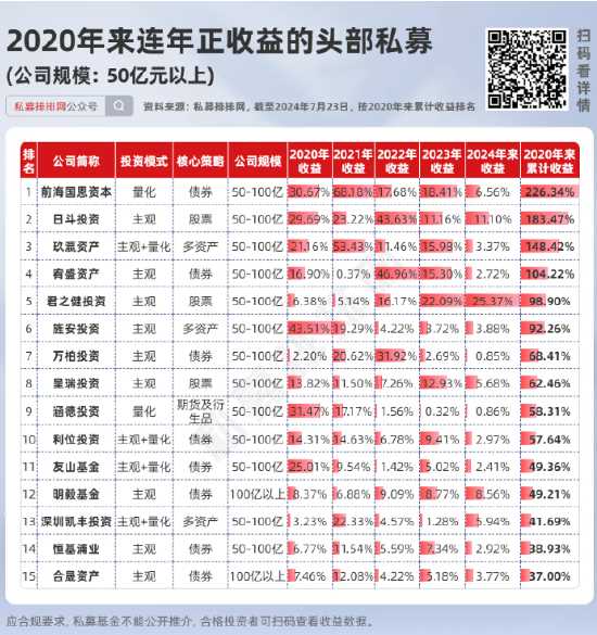 50亿以上规模:21家私募连续3年正收益!