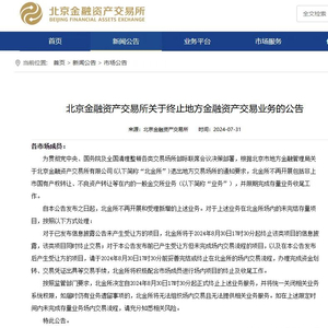 7月31日,北京金融资产交易所(下称“北金所”)发布公告称,根据北京市地方金融管理局关于北金所退出地方交易场所的通知要求,北金所不再开展包括非上市国有产权转让、不良资产转让等在内的一般金交所业务(下称“业务”),并限期完成存量业务收尾工作。