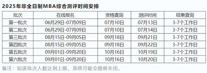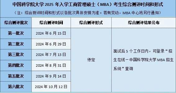 中国科学院大学 MBA 教育管理中心于 6 月 15 日、6 月 29 日、7 月 13 日、8 月 31 日、9 月 14 日、10 月 12 日,分 6 批安排审核通过的考生进行综合测评。