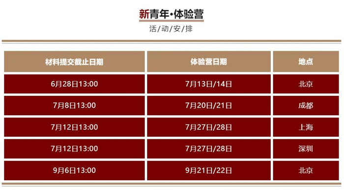 北大光华 MBA 首期新青年 · 体验营已于 7 月 13 日 -14 日在北京正式开营,成都、上海、深圳场次也将于 7 月份陆续开营,北京站第二场将于 9 月 21 日 -22 日开营,材料提交截止时间为 9 月 6 日。北京、成都、上海、深圳各场次的体验营面向所有非全项目的同学。申请全日制项目的同学,仅可选择北京场活动。