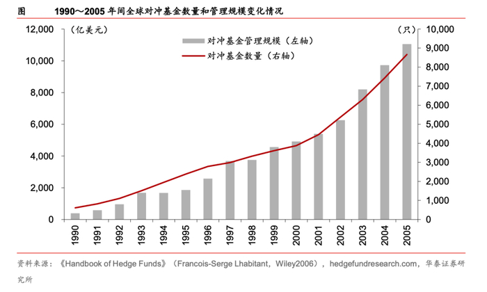 跨越21世纪,对冲基金行业迅速发展。2000年初,互联网泡沫破裂,美国经济增长放缓,股市动荡,高净值投资者开始寻求对冲基金作为避风港。根据Hedge Fund Research的数据,1990年全球约有600家对冲基金,管理规模不超过400亿美元。而到了2005年底,全球已有8000-10000家对冲基金,管理规模超过一万亿美元。这一时期,对冲基金数量和规模呈指数增长。