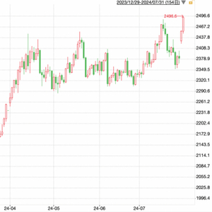 图1:COMEX黄金指数日K走势图(2023/12/29至2024/7/31)