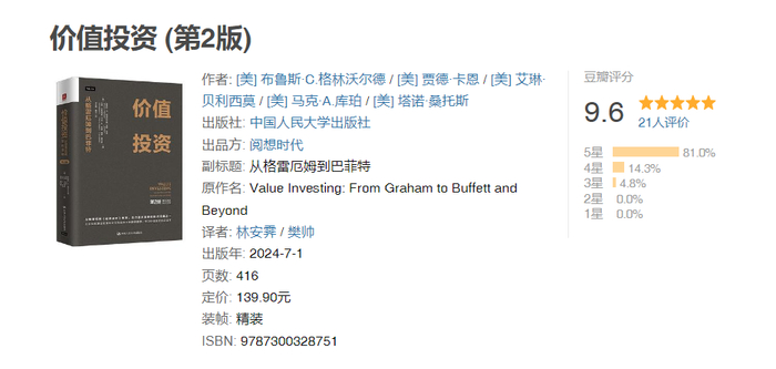 为了能原汁原味把书中的价值投资理念带给国内投资者,这本书的两位译者也很专业。林安霁本人就毕业于哥大的价值投资课程,授课老师正是本书作者之一的格林沃尔德。樊帅是清泉石资本合伙人,也曾经协助开设了北大光华价值投资课程并且担任助教。所以说,两位译者本人都对价值投资有深刻的理解。