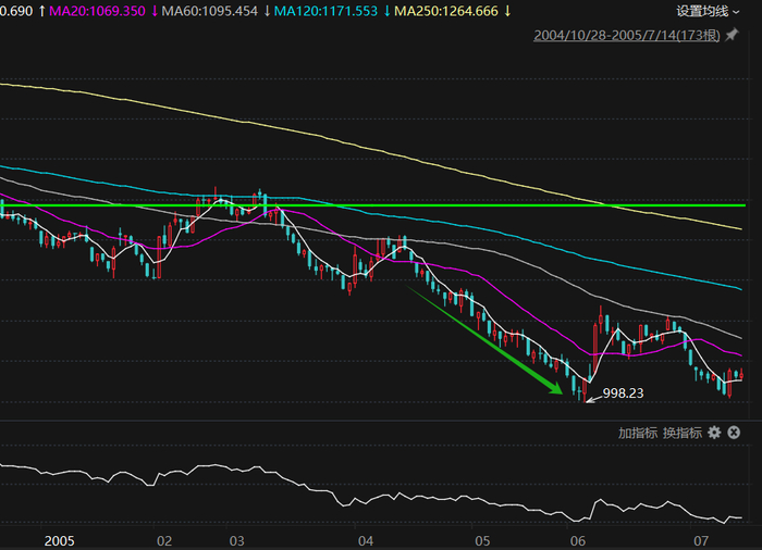 第一阶段从4月下旬到6月6日盘中出现998点的历史新低后反弹为止。