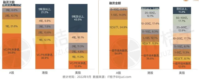 上图是2020-2022三年中国企业在各个市场的IPO统计分析。我们看到哪怕已经到了2020年,仍然有接近80%的A股上市公司,在IPO前的融资次数是在1次以内的。过去二十年,中国本土的创投VC,多数时候更像是催化剂。他们依靠敏锐的嗅觉,以及对中国本土资本政策的解读,赚的是一二级市场的差价,做的其实是套利的事情。