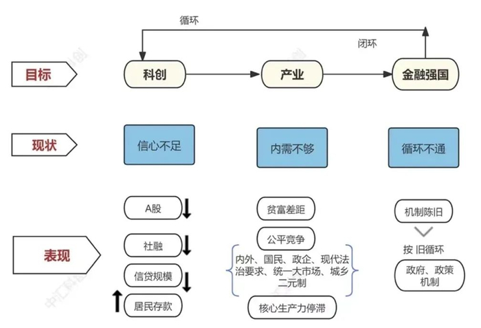 从上图我们可以看出,国家构想的目标是很完美的。中央引导金融转向科创,用科创带动产业,从而实现中国产业在本轮经济周期中的转型升级。但现状和表现出的数据却跟当初的设想不太一样。