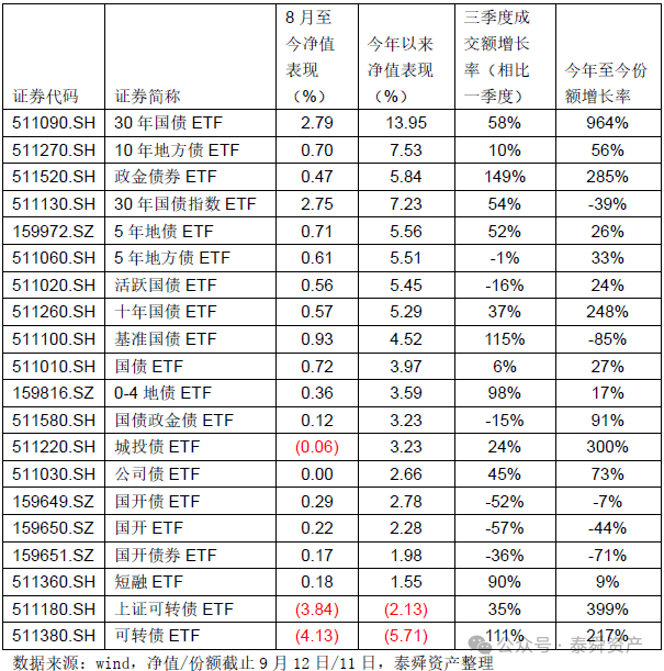 如此耀眼的业绩表现,也吸引了大量资金的参与,今年以来30年国债ETF的成交和持仓份额均出现大幅增长。从成交情况看,该基金一季度日均成交额4.77亿元,三季度日均成交额增加至7.54亿元,增长率58%。从持仓情况来看,该基金年初份额仅有334万份,但最新份额已经达到3553万份,增速高达964%。由此可以看到,市场从来不缺资金,缺的是赚钱效应。只要有赚钱效应,就是债基也能迎来高速增长。