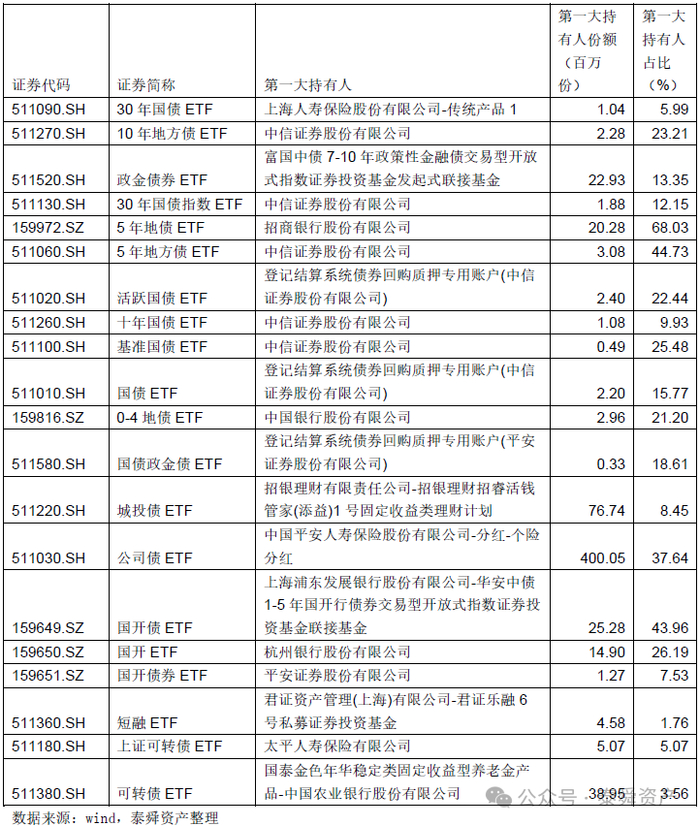 机构资金也在持续布局债券ETF。从20只债券ETF2024年中报披露的第一大持有人来看,包括银行、保险、券商、资管产品在内的机构投资者是债券ETF的投资主力。尤其是中信证券位居多只债券ETF的第一大份额持有人。
