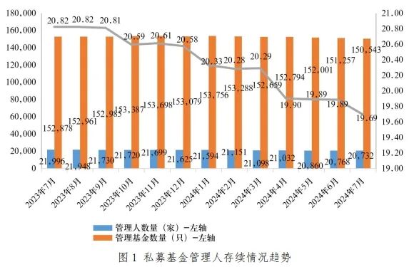 截至 2024 年 7 月末,存续私募基金管理人 20,732 家,管理基金数量1150,543 只,管理基金规模219.69 万亿元。其中,私募证券投资基金管理人 8,186 家;私募股权、创业投资基金管理人 12,316 家;私募资产配置类基金管理人 8 家;其他私募投资基金管理人 222 家。