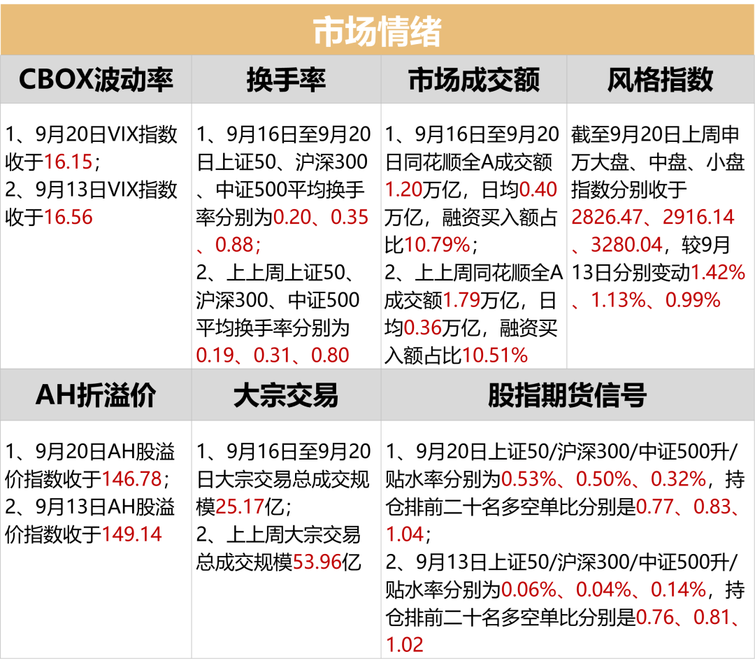 本交易周期(9/16-9/20)上证综指上行1.21%,深证成指上行1.15%,创业板指上行0.09%。两市成交1.68亿元,周度日均市场成交额为0.56万亿元,日均增长率为8.34%。上证综指换手率为0.62%,成交额0.75万亿元;深证成指换手率1.64%,成交额为0.93万亿元;创业板指换手率为2.51%,成交额0.40万亿元。