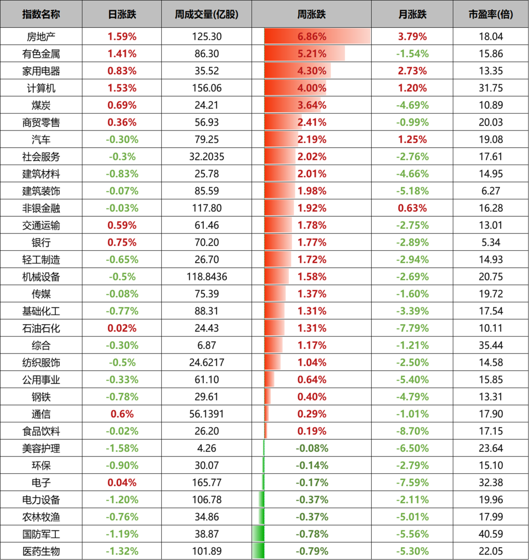 对比上周A股行情,本周A股实现反弹。行业方面,31个申万一级行业中有24个行业上涨,其中房地产、有色金属、家用电器与计算机涨幅靠前;而医药生物、国防军工、农林牧渔与电子设备跌幅靠前。