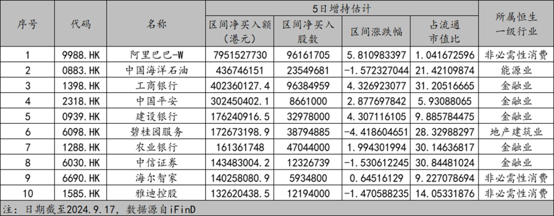 本周(9/16-9/20)沪港通净流入资金-0.10亿,深港通净流入资金54.52亿,合计净流入54.42亿。截至9月17日,南向资金近5日个股增持净买入额前三分别为阿里巴巴-W、中国海洋石油与工商银行。
