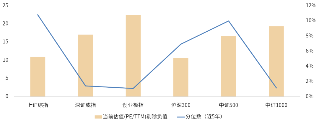 目前上证综指PE(TTM,剔除负值)上行至10.93倍,历史分位数上行至10.80%。深证成指PE(TTM,剔除负值)上行至17.04倍,历史分位数上行至1.40%。创业板指PE(TTM,剔除负值)上行至22.38倍,历史分位上行至1.07%。