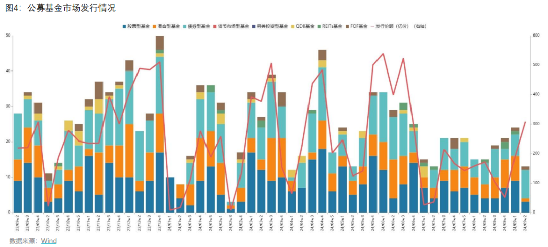 截至9月14日,全周合计发行13只,其中股票型基金发行3只,混合型基金发行1只,债券型基金发行8只,QDII型基金发行0只,FOF型基金发行1只,总发行份额308.24亿份。
