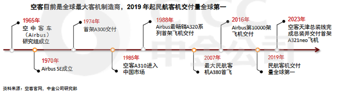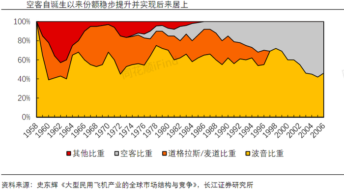 1970年12月,空客公司成立并于1974年交付首架商用客机,经过33年的发展实现了份额的反超。