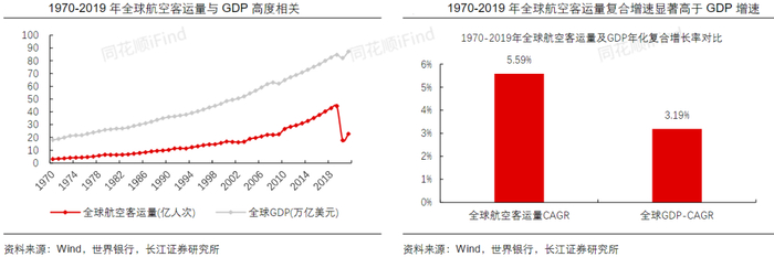 长周期下,全球航空客运量与GDP高度相关。