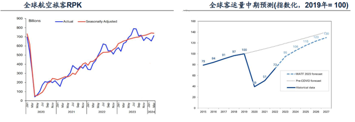 国际航空运输协会数据显示,2024年3月单月的收入客公里同比增长13.8%,已经超过了2019年的历史记录,客运量已处于2000年以来的创纪录水平,预计2024年全年数据将恢复至2019年的水平。