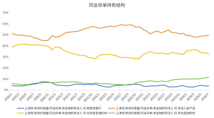 具体到不同银行的持仓,农商行和国有行是同业存单的主要配置方。截至2024年7月,农商行与国有行持有同业存单占银行机构整体持有规模为35.19%和32.17%。国有行通常资金规模较大,会通过买入同业存单进行资金调配。农商行由于深耕当地,在揽储上具备一定优势。但由于农村地方贷款需求有限,且农商行跨区域性放贷能力也较弱,因此配置存单的需求相对应较强。