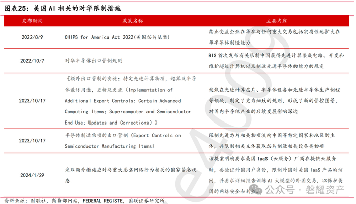 然而在美国的科技封锁之下,自2022年开始中国就已经被美国通过出口管制、实体清单、法案等一系列的方式限制对于GPU的采购和生产环节(晶圆制造)的卡脖子。此外美国更是限制了中国用户对于美国IaaS、AI API的接入及访问。