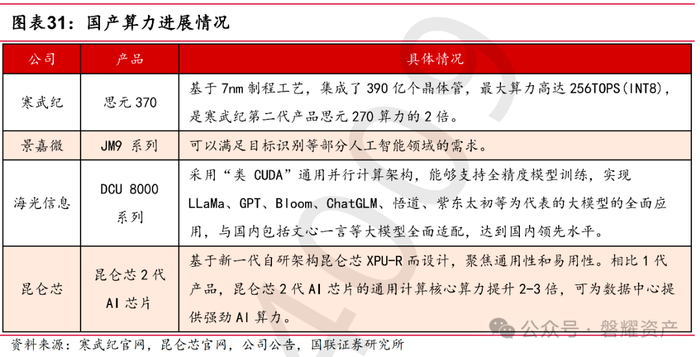 我们通过华为、寒武纪等国产GPU厂商的公开信息可以看到与英伟达的数据的对比,虽然国产GPU仍然在处于追赶的状态,但是目前例如寒武纪、华为、海光、昆仑芯已经基本上可以实现对于推理的需求;而随着这一类厂商进一步的推进GPU的研发,例如更先进的思元5xx系列、昇腾9xx产品推出之时,我们有望能实现对于国产大模型训练的部分需求。