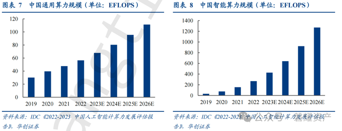 再到中国的算力需求角度,同样根据IDC的当前 AI 技术正加快融入千行百业,超大规模 AI 模型和海量数据对算力的需求也持续攀升。云游戏、元宇宙、VR/AR 等新应用场景加速发展,大模型的训练和推理过程进一步带动算力需求爆发,同时也推动算力需求由通用性 CPU 算力向高性能 GPU 算力发展。据 IDC,2022年,我国智能算力规模达 268 EFLOPS,预计 2026 年达 1271.4 EFLOPS,进入每秒十万亿亿次浮点计算级别,2022-2026 年 CAGR达47.6%,远超通用算力增速。