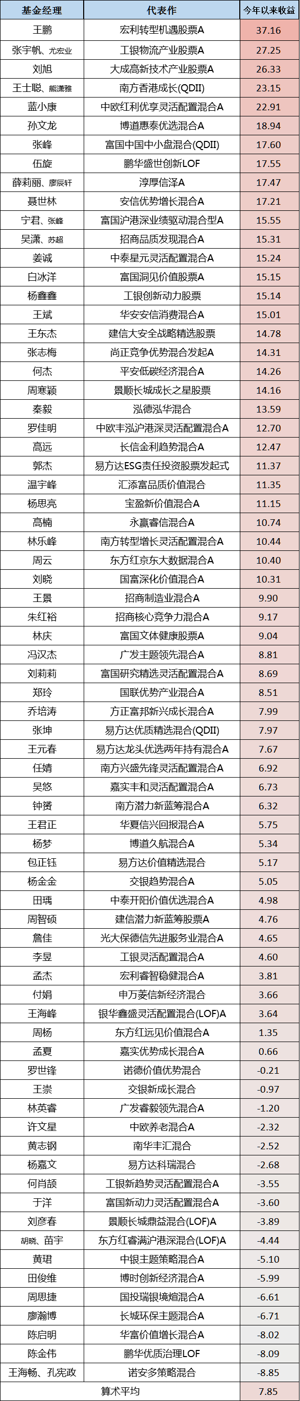 我们再看一下具体的基金经理今年以来收益。会发现榜单排名靠前的基金经理风格差异很大,这意味着榜单优异的业绩,并不是因为受益于某一种风格,而是这群基金经理自身确实有不错的超额收益。