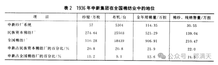 到1936年,申新9家纺织厂共拥有纱锭57万枚,布机5300余台,分别占全国民族资本纺织业的20.8%及20.7%,占全国纺织业(包括外资)的11.2%及9.1%。