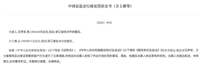 根据证监会发布的《中国证监会行政处罚决定书(方士雄等)》显示,“方士雄”将开设的广发证券信用户、天风证券普通户、天风证券信用户,恒力期货账户、国海良时期货账户出借给王孝安使用。