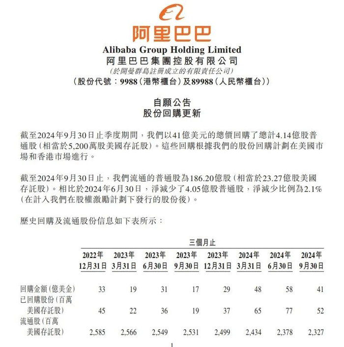阿里过去一个季度通过回购将流通股减少了2%