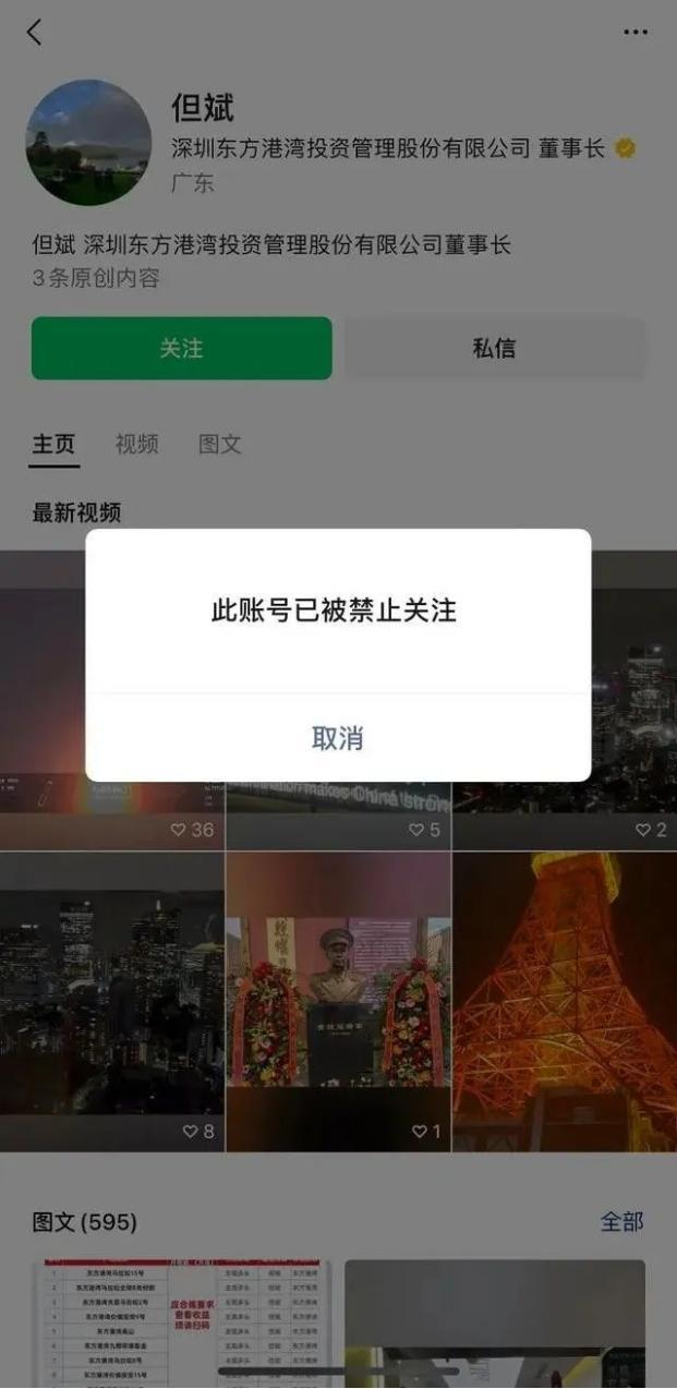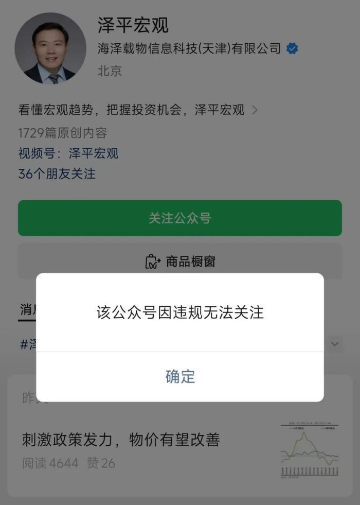 近日,网红经济学家任泽平与私募大佬但斌在社交媒体隔空互呛多日引发关注。10 月 15 日晚间,任泽平公众号 " 泽平宏观 " 因违规无法关注,视频号同样显示 " 此账号已被禁止关注 "。但斌的视频号账号也被禁止关注。