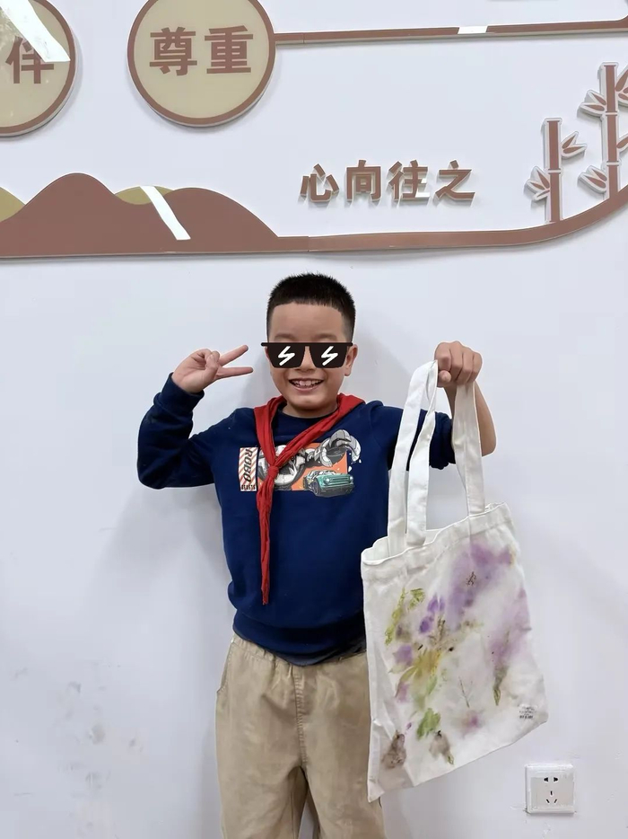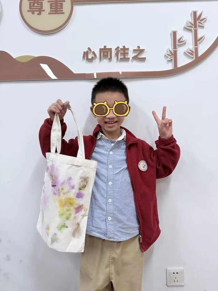 通过树叶、花瓣作为拓印工具,在白色的帆布包上留下独一无二的印记,没有固定的图案,没有限定的颜色。每一个小朋友都是独一无二的小艺术家。站在聚光灯下,自信分享自己的拓印作品,这份成就感与喜悦,将成为他们在成长道路上宝贵的财富。