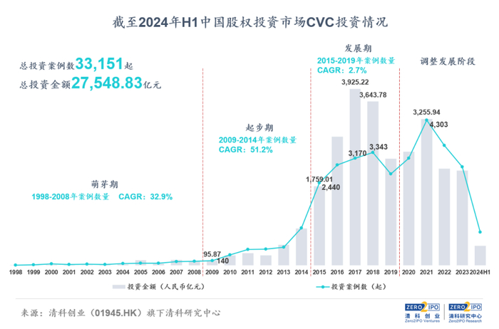 中国CVC投资自1998年萌芽,在二十余年的时间内历经了萌芽、起步、快速发展期,并于2020年开始步入调整发展期。在此期间,境外产业背景企业、各行各业的优质本土企业积极参与股权投资,以实现财务、战略协同、生态构建等目标。根据清科创业(01945.HK)旗下清科研究中心统计,截至2024年上半年我国共有接近8,000家产业集团【1】直接或通过下属投资平台【2】参与过股权投资,合计完成CVC投资案例33,151起,披露的累计投资金额达到27,548.83亿元人民币。