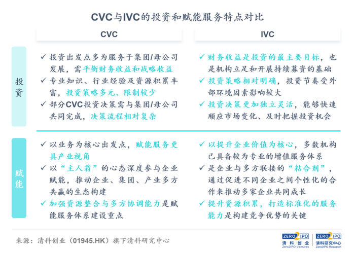 CVC与IVC(独立创投)的组织形式存在差异、资源和能力禀赋不同,在投资和为被投企业提供赋能服务时也各有侧重和优势。