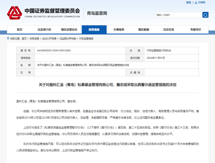 11月1日,青岛证监局对盈科汇金(青岛)私募基金管理有限公司及高管出具警示函。