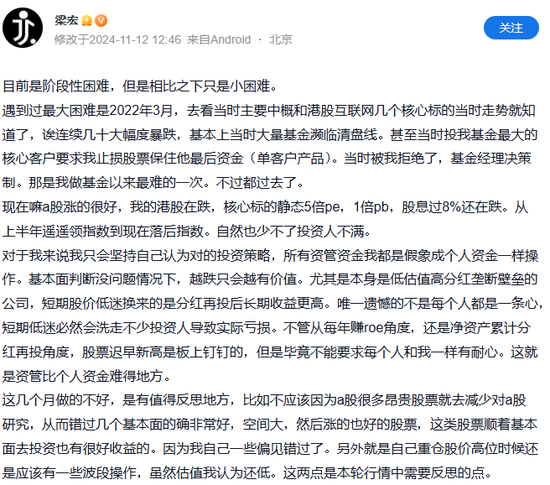 梁宏近日在社交平台上坦言:“这几个月做得不好,是有值得反思的地方,比如不应该因为A股很多昂贵股票就去减少对A股研究,从而错过几个基本面非常好、空间大、涨得好的股票,这类股票顺着基本面去投资也可以有很好的收益,因为我自己一些偏见错过了。另外就是自己重仓股价高位时候还是应该有一些波段操作,虽然估值我认为还低。这两点是本轮行情中需要反思的点。”
