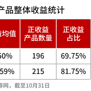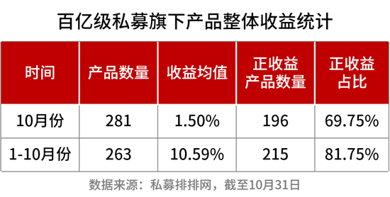 私募排排网数据显示,有业绩展示的281只百亿级私募旗下产品10月份收益均值为1.5%。其中,196只产品实现正收益,占比为69.75%。
