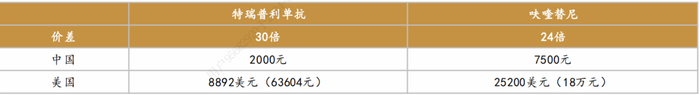 君实生物的PD-1单抗于2023年10月底获得美国FDA的批准后,在美国的定价为每瓶8892.03美元,折合人民币约63604.69元,这一价格是其在中国市场不足2000元人民币售价的30倍以上。