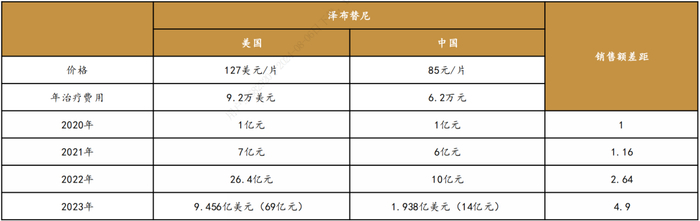 以百济神州的泽布替尼为例,2022年,泽布替尼在美国实现26.4亿元销售额,国内销售额为10亿元。2023年,泽布替尼美国收入69亿元,中国收入14亿元,相差4.9倍。这背后深刻体现了中美两国在定价、渠道推广、销售峰值等多项差异。