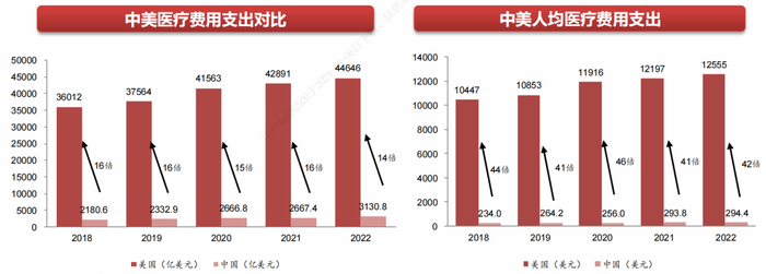 2018年,美国总医疗费用支出是中国的16倍,同年美国人均医疗费用支出是中国的44倍。尽管近年来中国医疗行业发展迅速,差距逐步缩小, 2022年美国医疗费用支出是中国的14倍,人均医疗费用是中国的42倍。