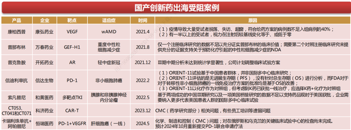从受阻原因来看,基本都是缺乏代表美国患者人群的国际多中心临床试验数据或者海外临床试验疗效不及预期。